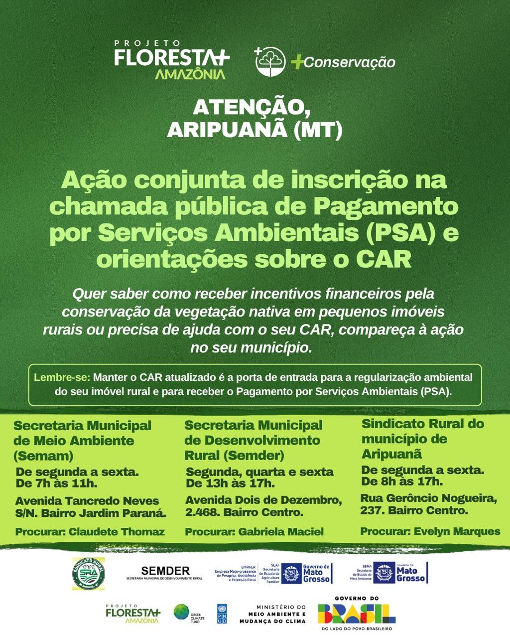 A Prefeitura de Aripuanã, por meio da Secretaria Municipal de Meio Ambiente (Semam) e da Secretaria Municipal de Desenvolvimento Rural (Semder), está apoiando uma importante ação voltada a agricultores familiares e proprietários de imóveis rurais com até quatro módulos fiscais no município. A iniciativa ocorre em parceria com o Projeto Floresta+ Amazônia e tem como foco orientar produtores sobre acesso a benefícios ambientais e regularização de suas propriedades.